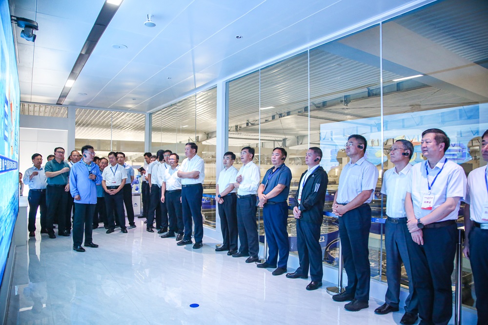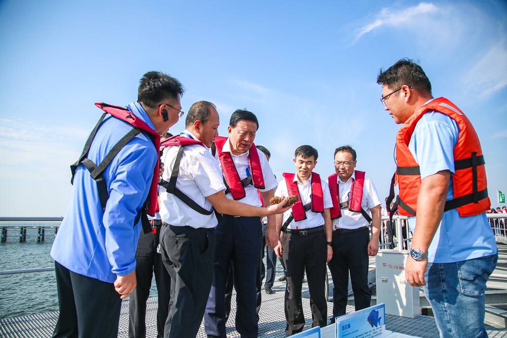 与会领导观摩调研烟台莱州现代渔业产业园(山东海洋明波水产北繁基地)与“蓝钻一号”大型生态围栏。