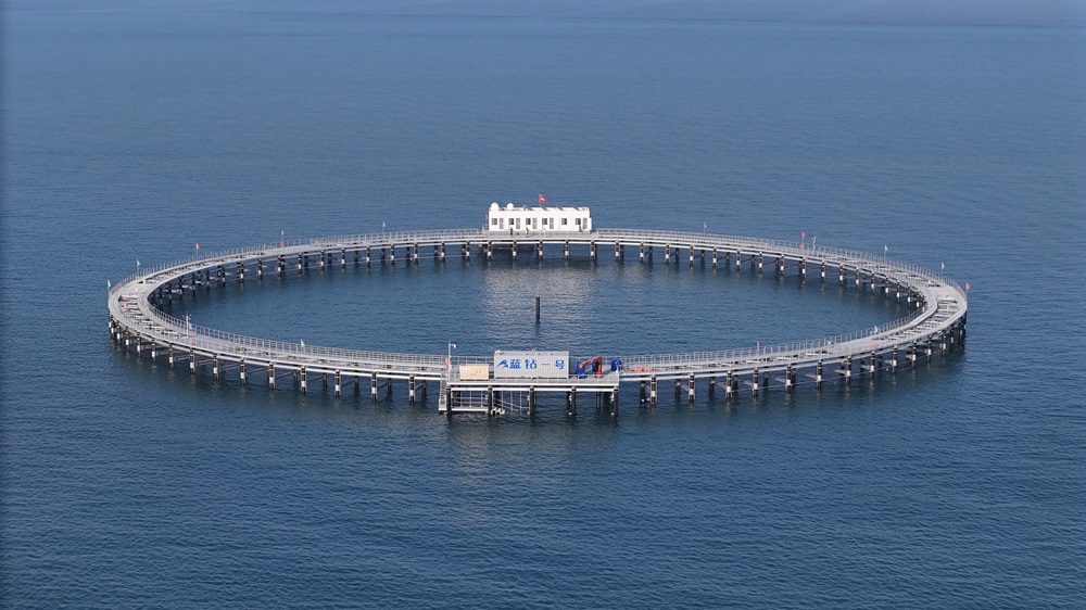 “蓝钻一号”大型生态围栏周长400米,直径127米,水深13米,水体16万立方米,由172根钢桩组成,抗风浪等级12级以上,双层PET网衣由明波网业公司自主生产,防生物附着易于清理,耐流能力强保障养殖安全,开展了斑石鲷、黄带拟鲹、黄条鰤等优质鱼类大水面立体生态养殖,年可产优质健康商品鱼300吨以上;配套大型气动投喂装备、环境监测装备、活鱼转运装备、水下机器人(仿生鱼)、无人机等装备,推进智慧渔业进程;配套内外走道及2个多功能平台,开展垂钓观光、餐饮娱乐等功能的休闲渔业,实现一、三产业融合,诠释现代渔业、生态渔业、智慧渔业。