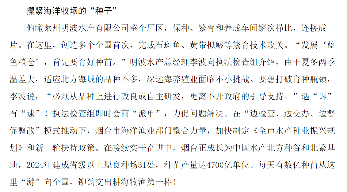 作为国家级原种场、全国现代渔业种业示范场、国家种业阵型企业,山东海洋明波水产将在未来持续助推农业良种工程,赋能新质生产力,打造中国种业创新高地,为渔业种业嵌入“中国芯”。